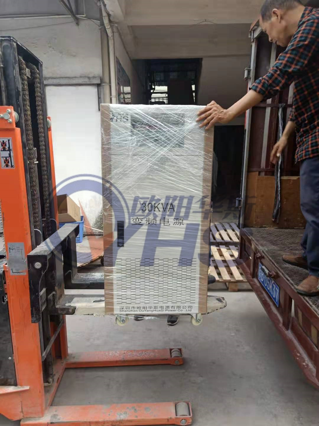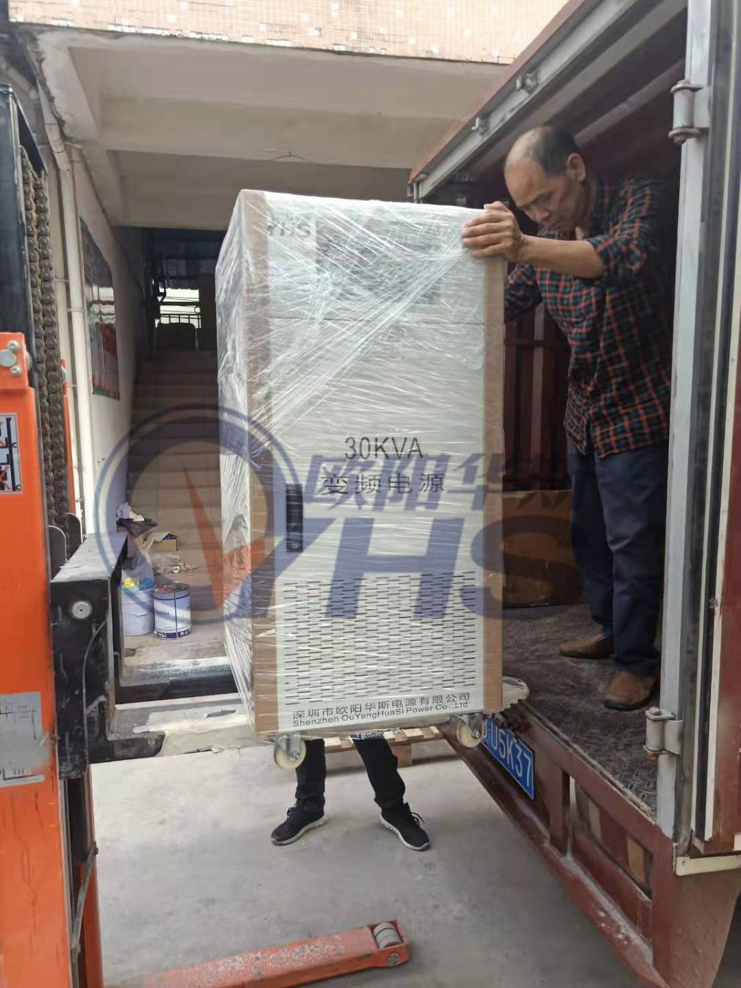 欧阳华斯30KVA双火线变频电源出货佛山南海客户现场,测试出口卫浴产品。