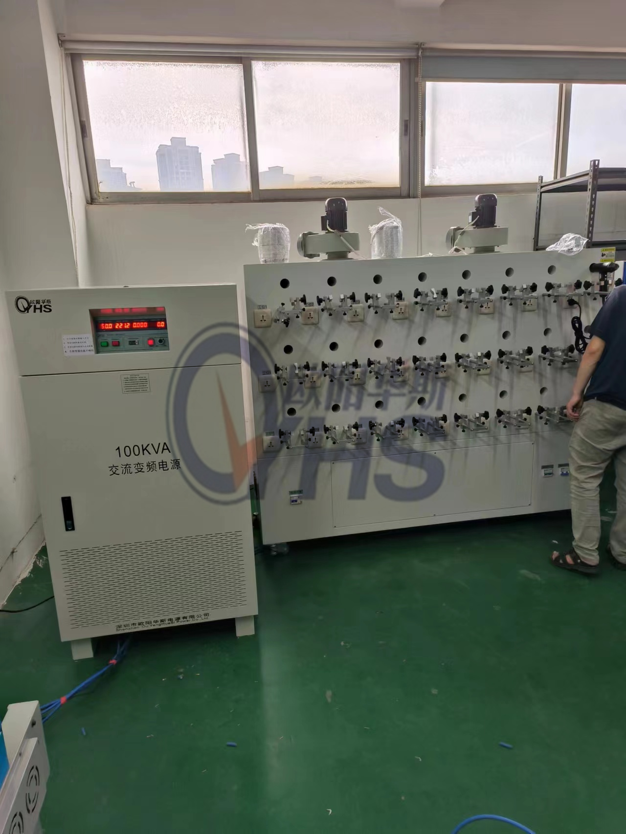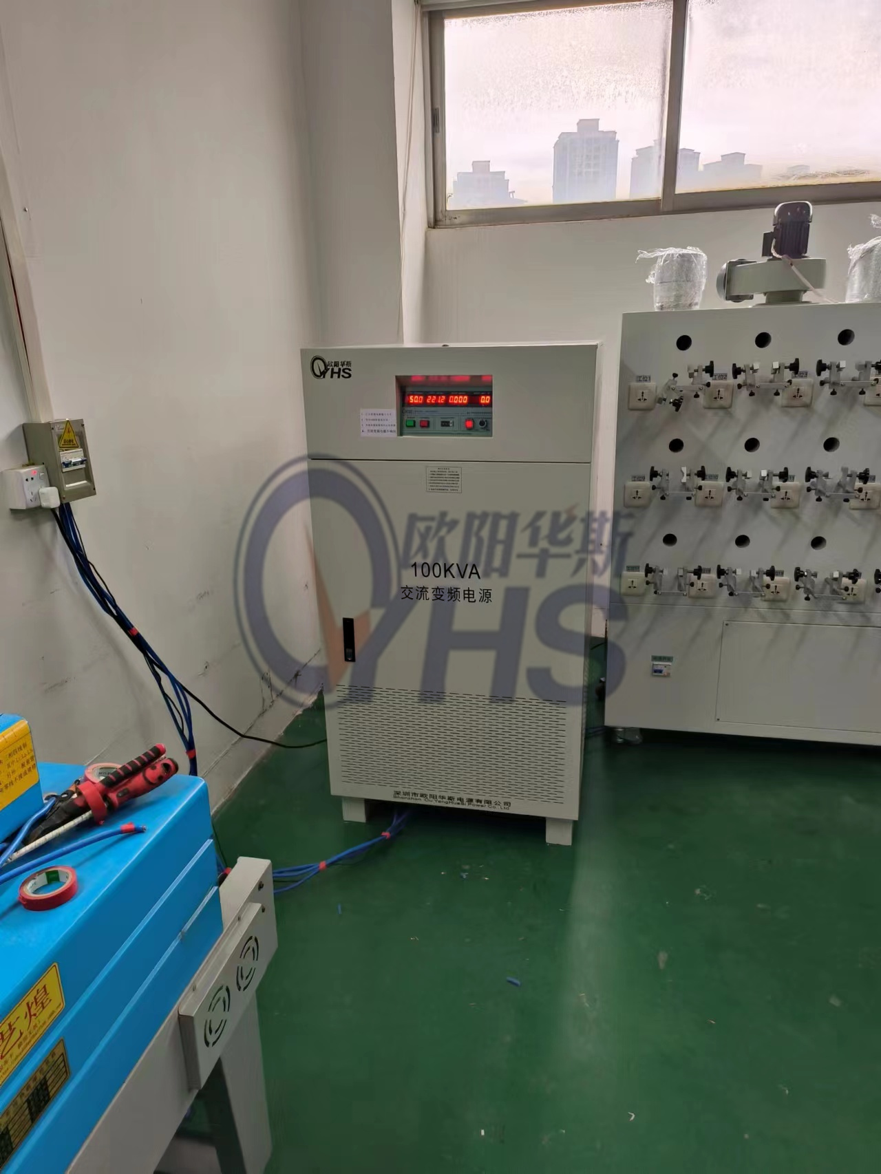 欧阳华斯100KVA变频电源出货东莞美容美发电器厂家,测试出口小家电产品,输出120V 60HZ。