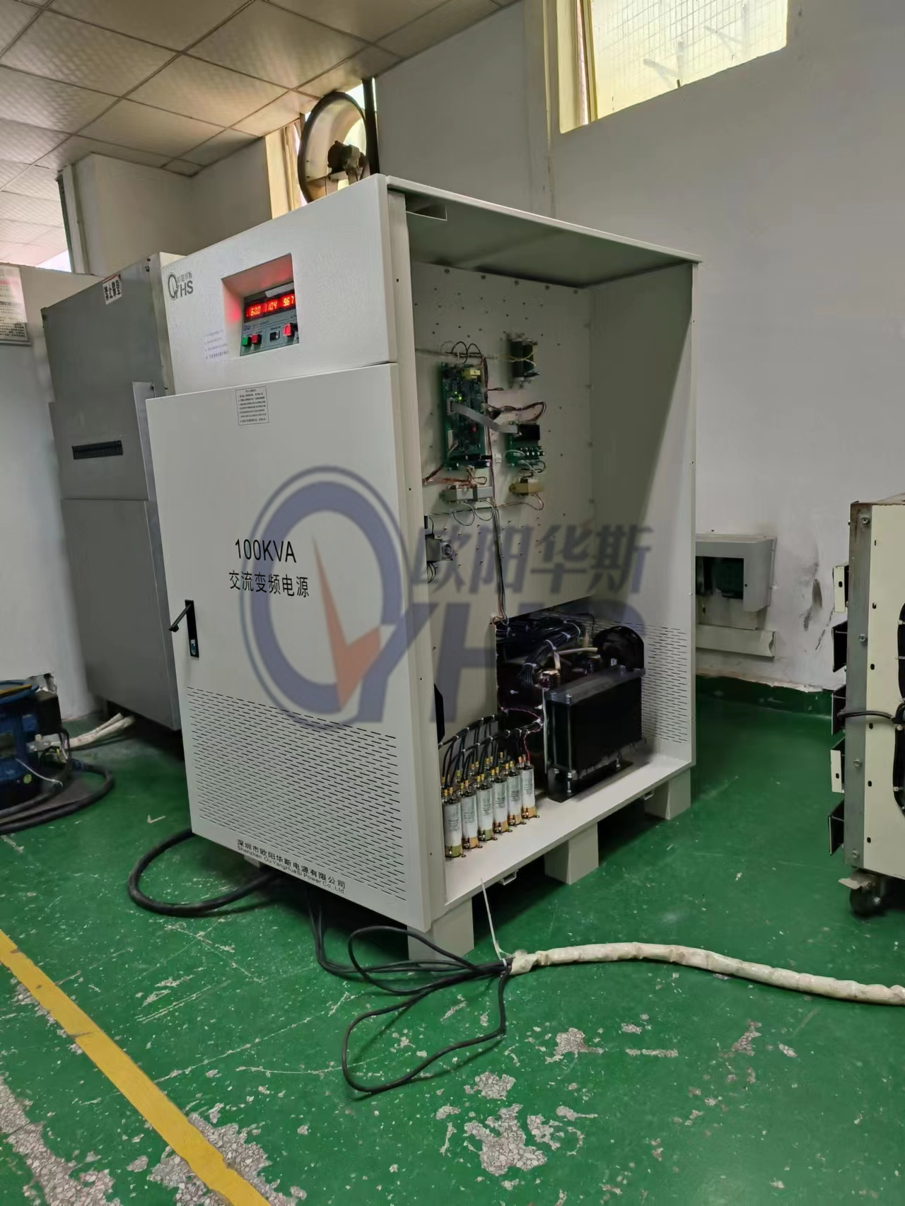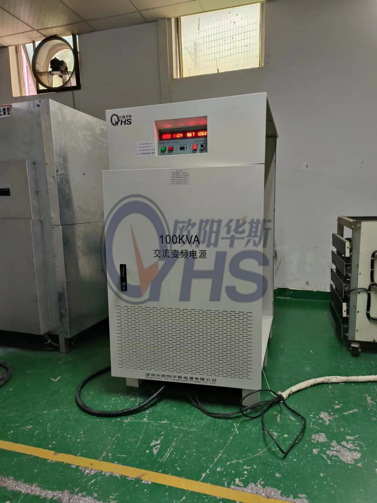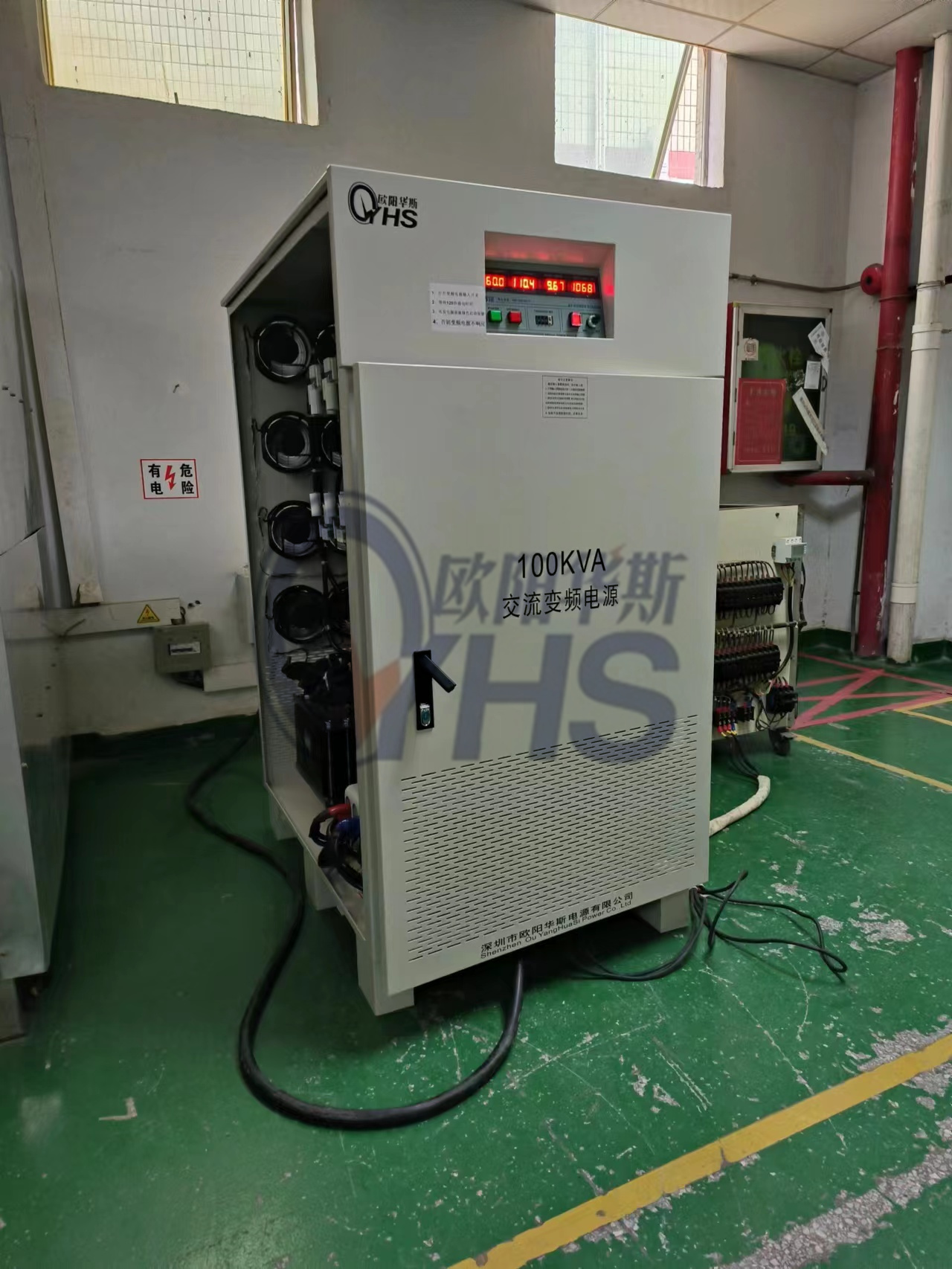欧阳华斯100KVA单相变频电源出货深圳客户现场,输出120V 60HZ,测试出口小家电产品。