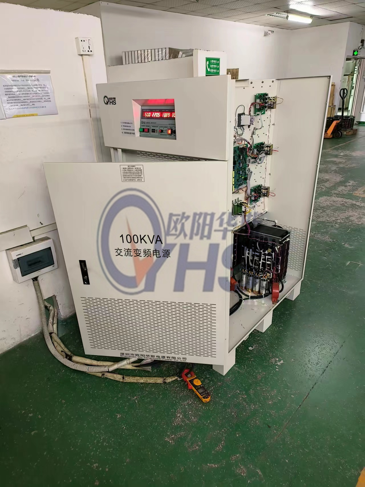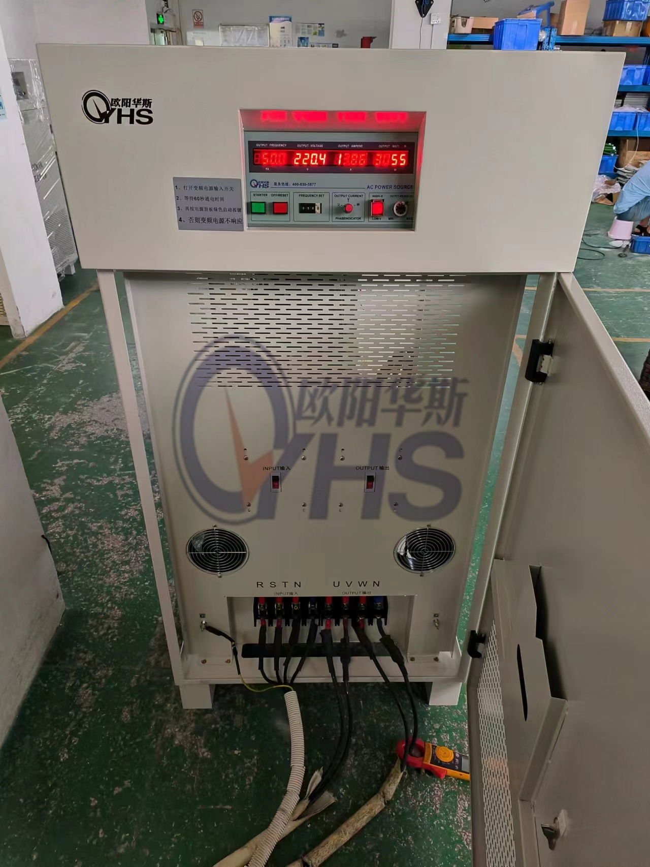 欧阳华斯三相100KVA变频电源,输入三相380V 60HZ,输出三相380V 50HZ,配国内设备使用。