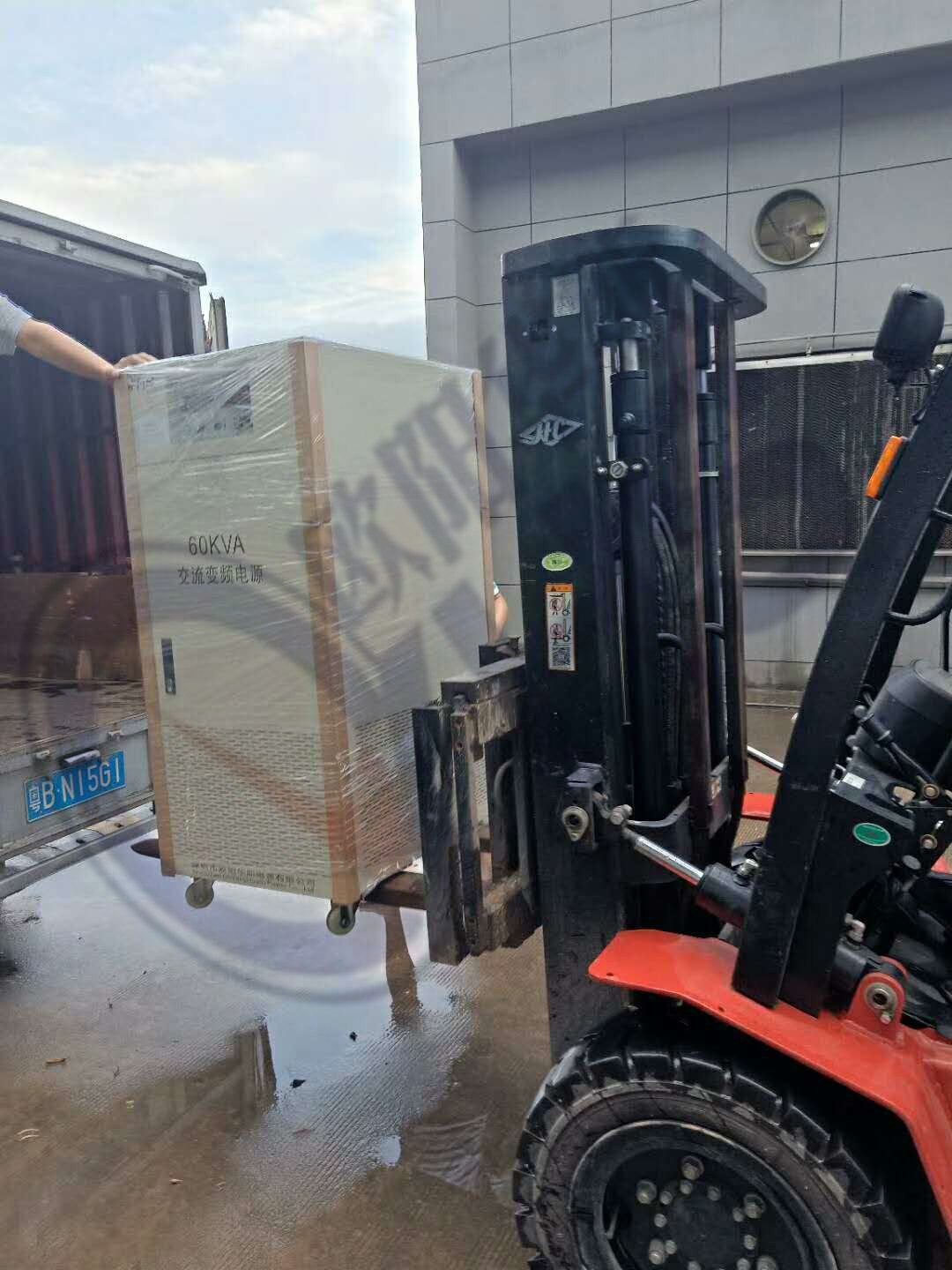 出货三进单出60KVA变频电源,送往佛山,调频调压变频电源给设备供电使用,此台电源规格为三进三出,三相380V 50HZ or 60HZ输入,0-300V电压连续可调输出,40-499.9HZ频率连续可调输出。型号:OYHS-98860,已送达客户现场,客户对此电源做了验收测试,完全符合客户需求。现场如图