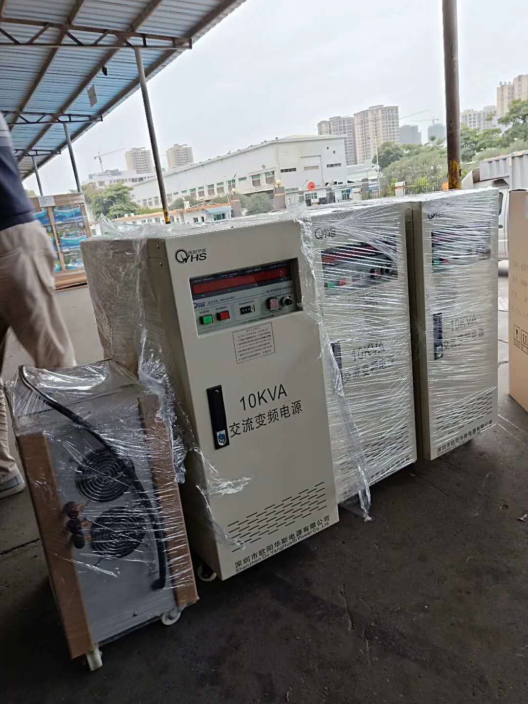 单进单出10KVA变频电源,220V/50HZ转110V60HZ给出口家电供电使用,此款型号OYHS-9810共3台,规格三进三出和一台150V 60A直流电源,目前已送到客户现场,客户通电使用满足需求,如现场图