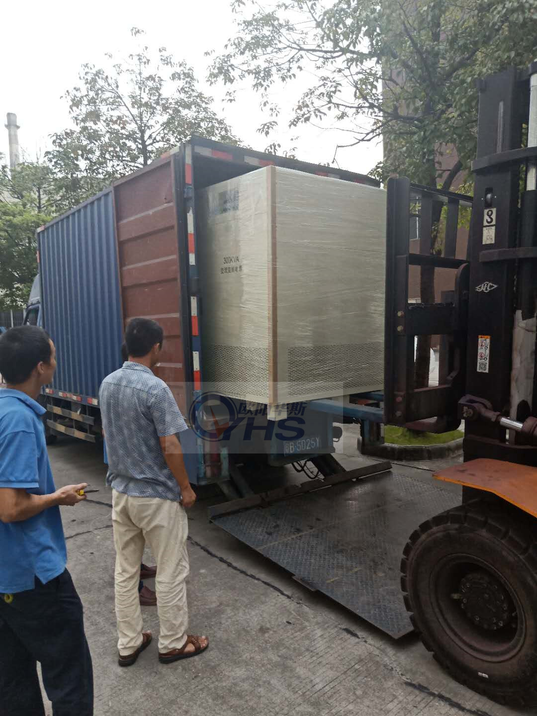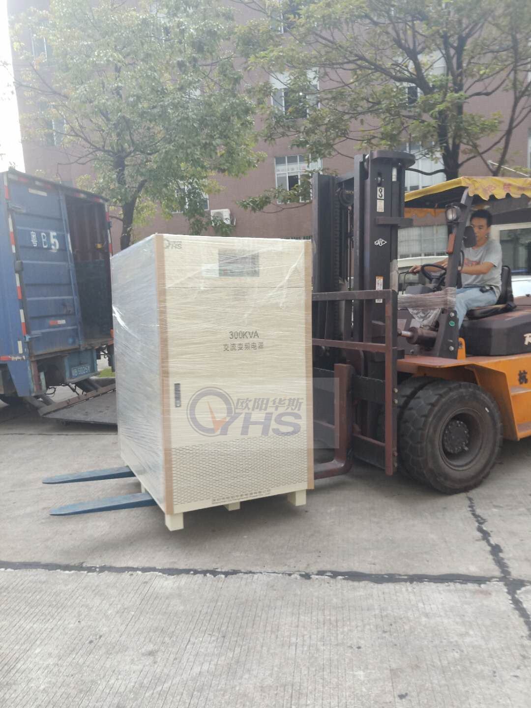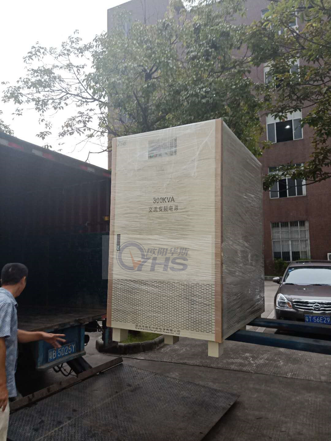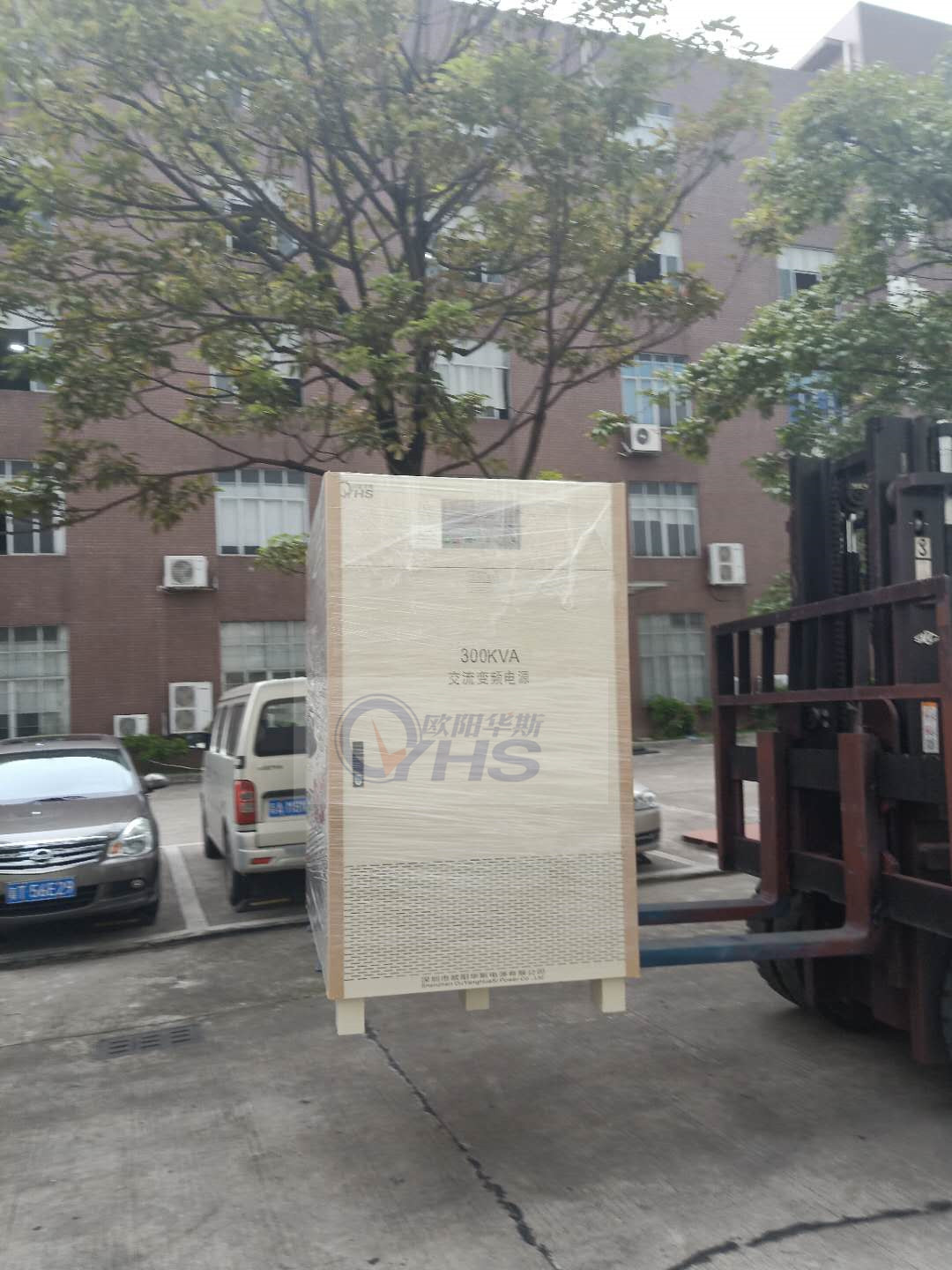 欧阳华斯厂家出货现场三相300KVA变频电源,输出电压460V 60HZ,测试出口设备。此为在客户下货现场。