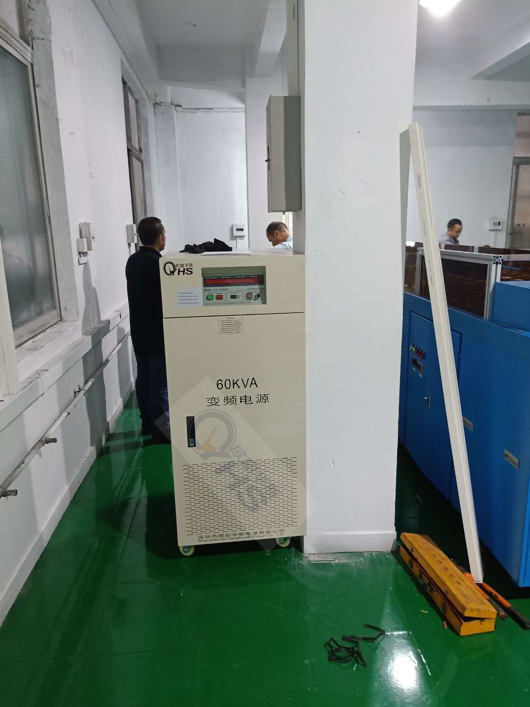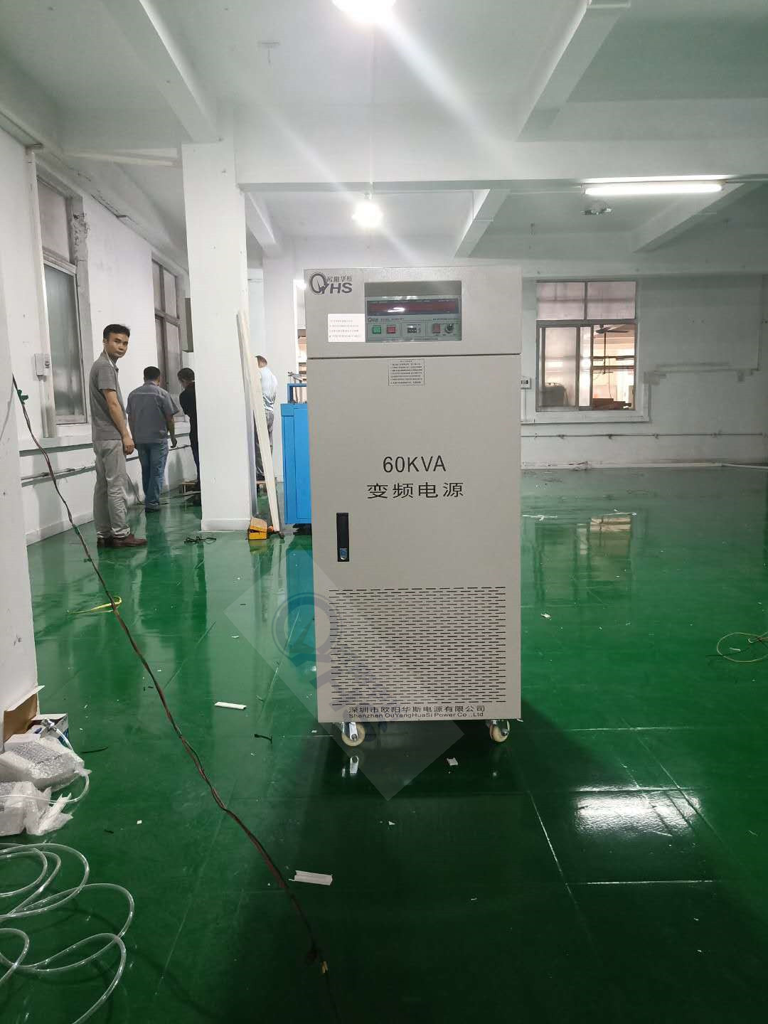 深圳欧阳华斯工厂生产60KVA变频电源,输出电压220V 50HZ带PTC设备,稳压稳频,高精度输出。图为变频电源装机现场。客户刚装修厂房。