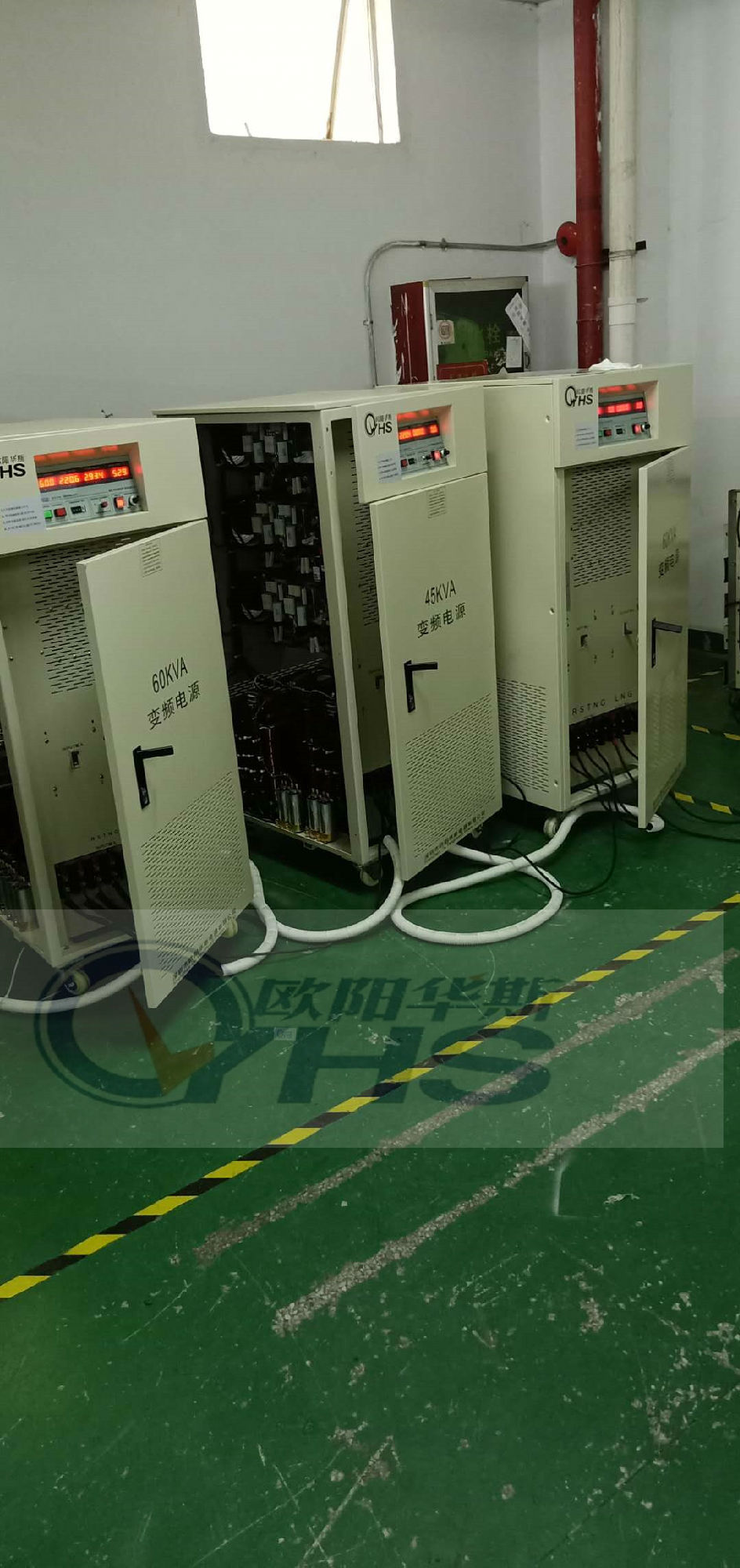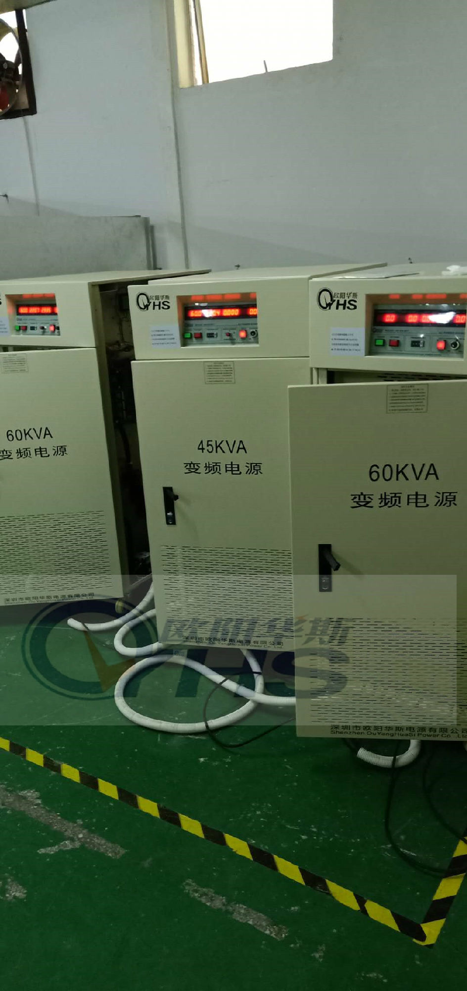 欧阳华斯工厂三相60KVA变频电源和三相45KVA变频电源准备出货浙江宁波客户,测试三相电机,60HZ输出