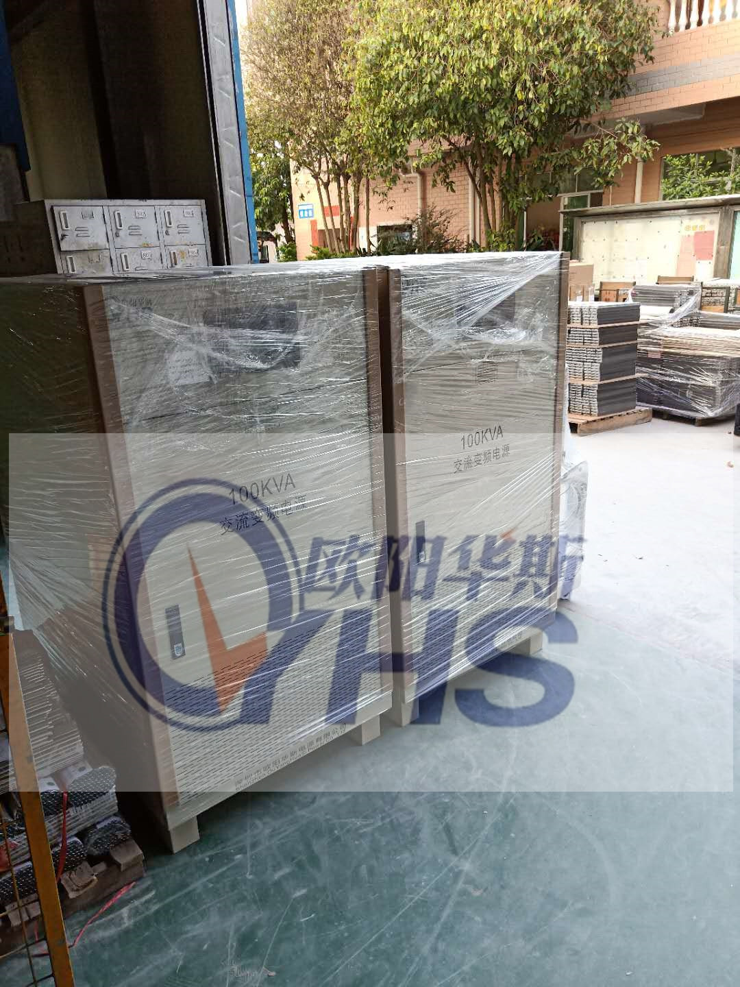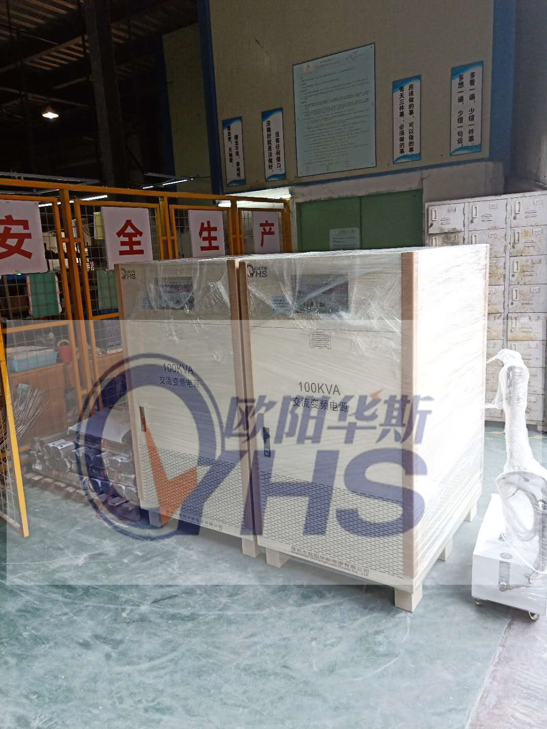 欧阳华斯二台100KVA变频电源出货清远客户现场,测试发热管,输出220V 50HZ