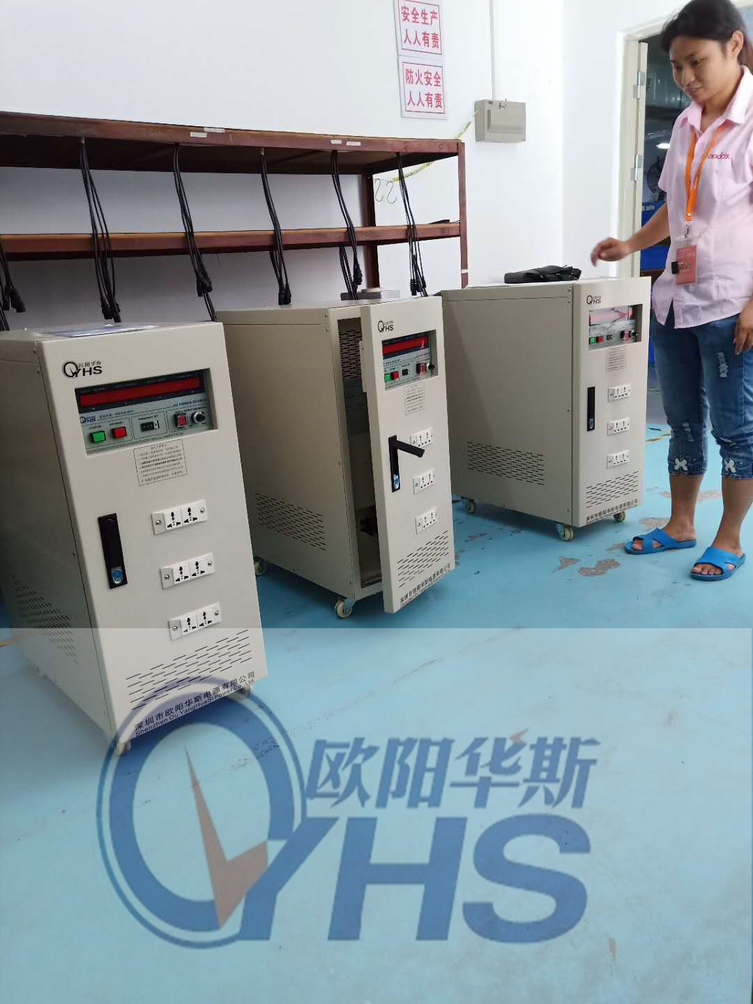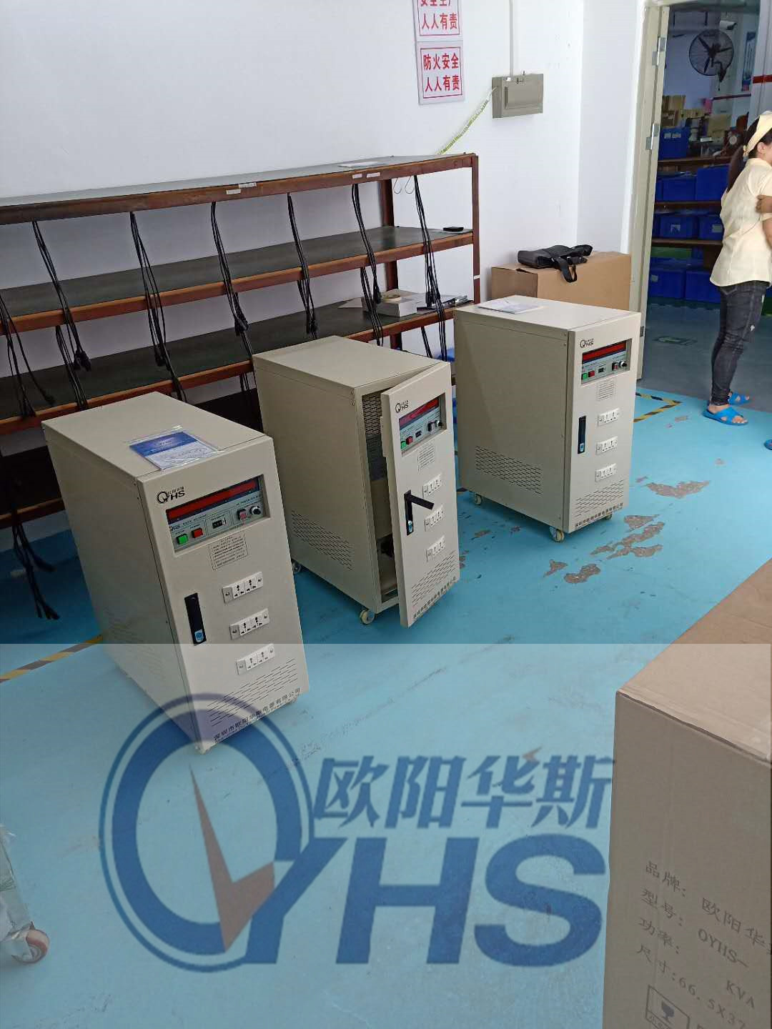 欧阳华斯厂家提供三台10KVA变频电源,测试摄像机,输出120V 60HZ,输出增加三组插座,方便测试使用。
