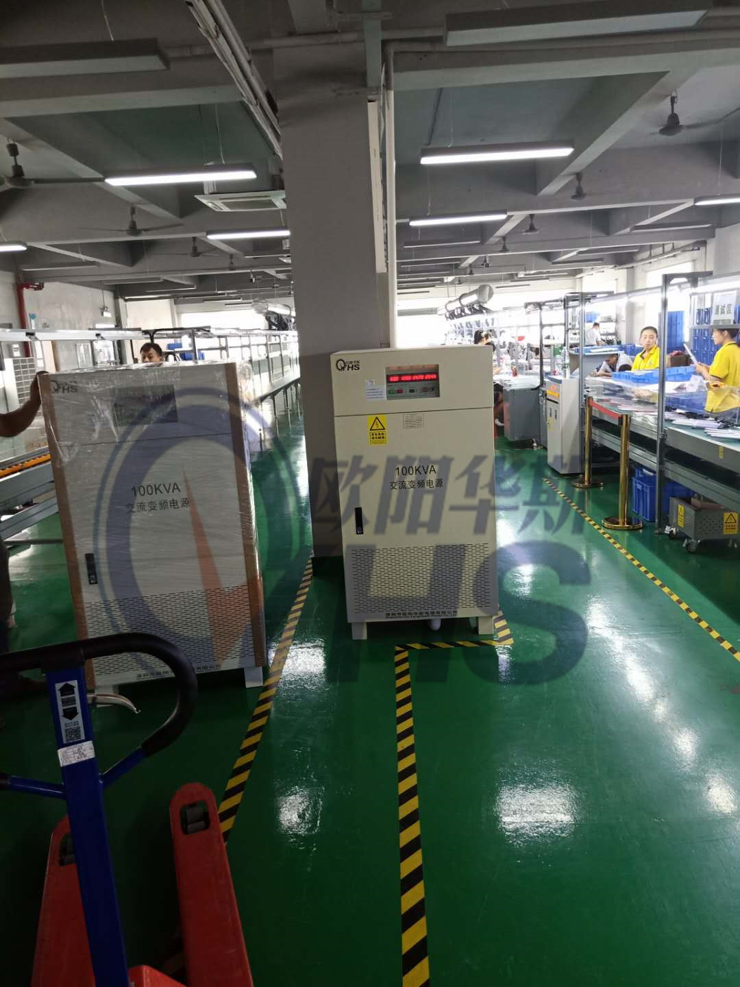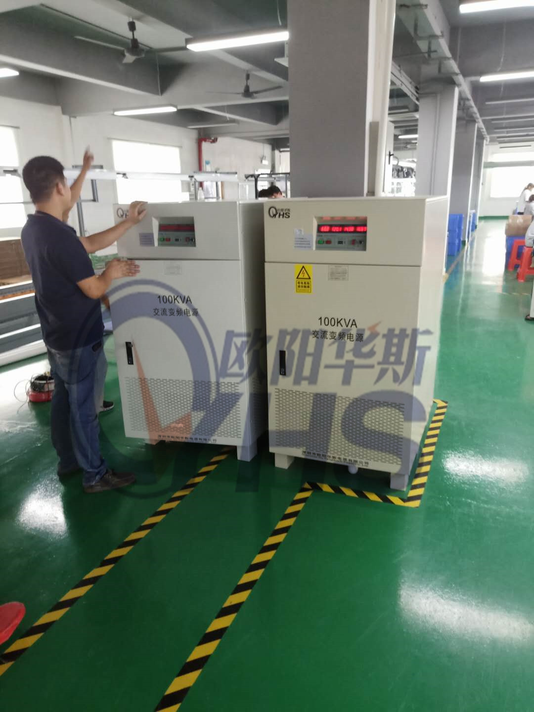 欧阳华斯二台100KVA变频电源送货东莞常平客户现场,测试直发器产品,110V/60HZ变频电源。