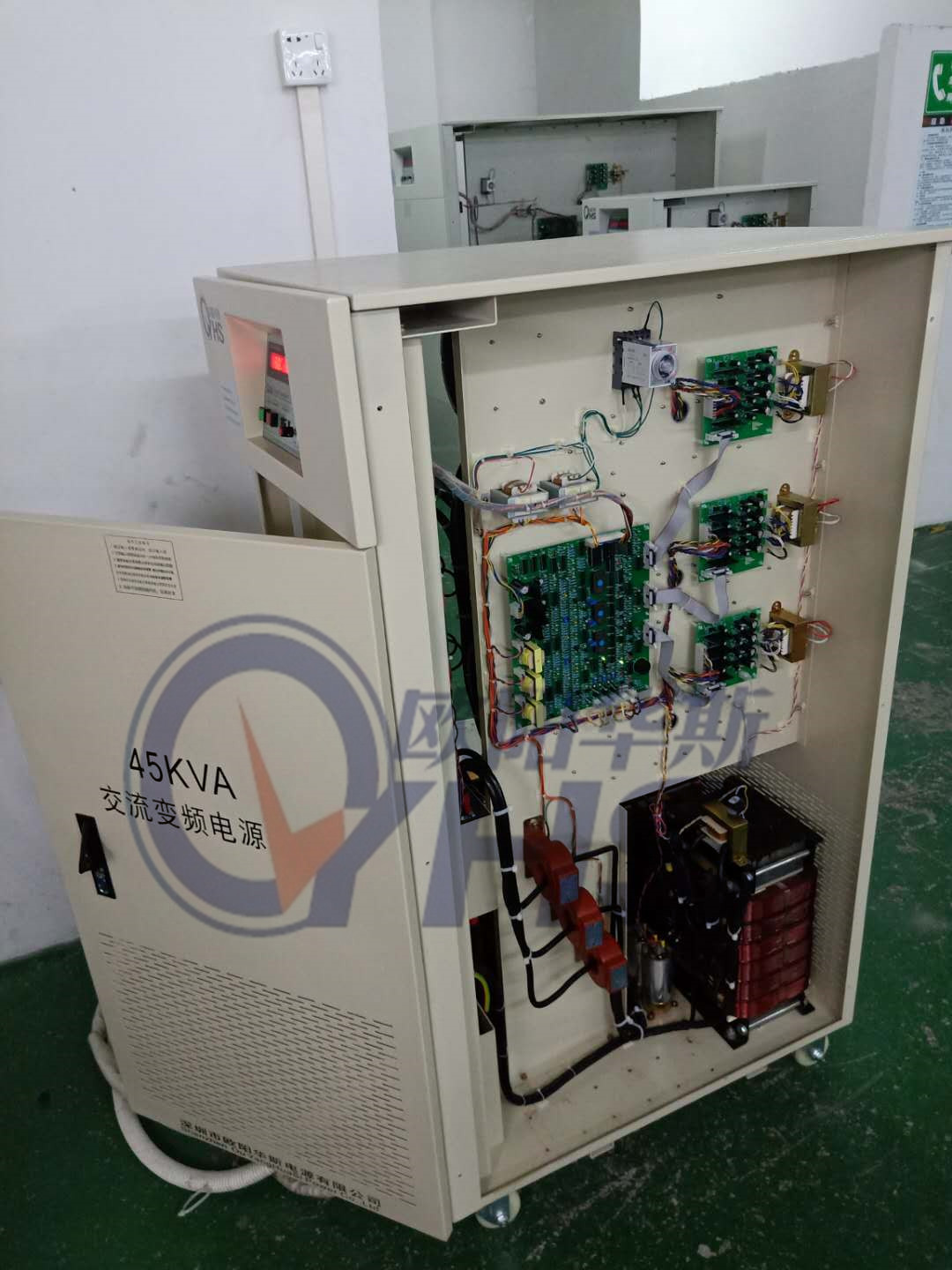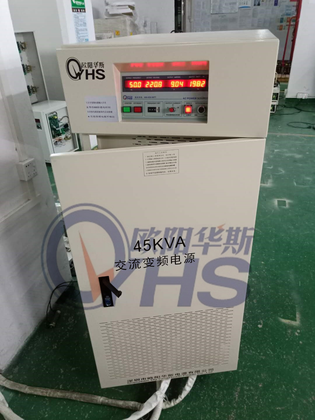 欧阳华斯三相45KVA变频电源,输入380V/60HZ,输出380V/50HZ,配国内冷水机使用。